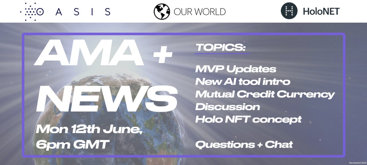 Our World/HoloNET/OASIS LIVE AMA - Monday June 12th 6pm GMT, Zoom - The NextGen Software team are hosting an AMA about about their exciting projects: Our World The Game, Oasis API and the HoloNet . Submit your questions for them here!